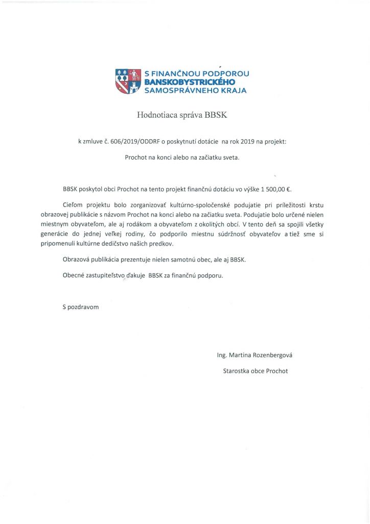 Obecné zastupiteľstvo sa týmto chce poďakovať BBSK za poskytnutie finančnej dotácie obci Prochot na projekt "Prochot na konci alebo na začiatku sveta" v sume 1 500,00 €.
